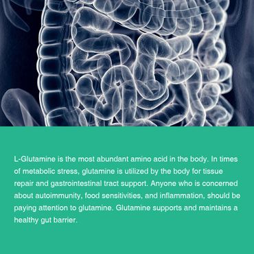 L-Glutamine is the most abundant amino acid in the body. In times of metabolic stress, glutamine is utilized by the body for tissue repair and gastrointestinal tract support. Anyone who is concerned about autoimmunity, food sensitivities, and inflammation, should be paying attention to glutamine. Glutamine supports and maintains a healthy gut barrier.