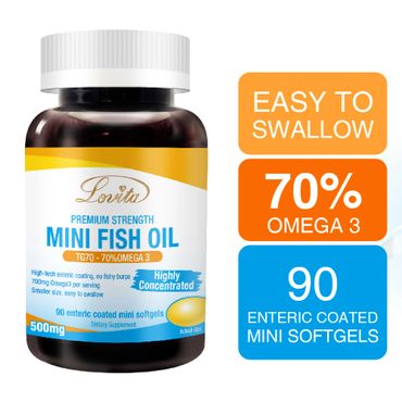 Our mini sized softgels are easy to swallow and ideal for consumption by women and seniors. The softgels are 60% smaller than our regular fish oil supplements.