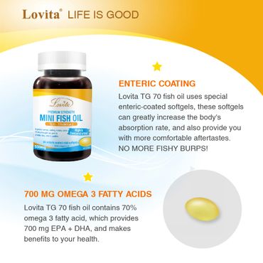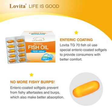Enteric coating for better absorption of the Omega-3 fatty acids resulting in no fishy aftertaste or burps. Each serving delivers concentrated EPA and DHA in true triglyceride form for optimal absorption.
