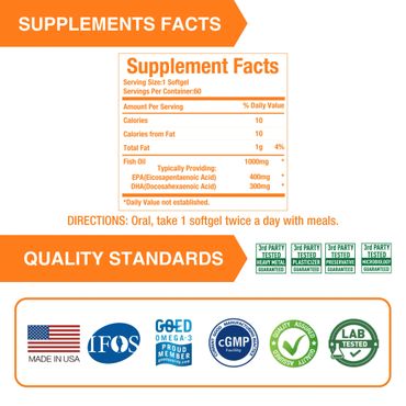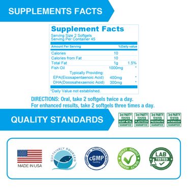 Our Mini Fish Oil comes in small size while delivering the high potency possible. Each serving (2 softgels) contains 1,000mg fish oil with 700mg of Omega-3 Fatty Acids (400mg EPA, 300mg DHA).