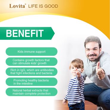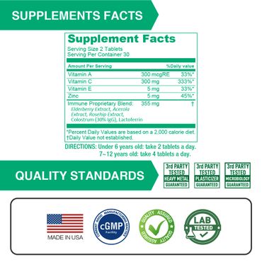 Each serving KIDS IMMUNE SUPPORT FORMULA contains immune booster 355mg blend of Elderberry, Acerola, Rose Hip extract, Colostrum (30% IgG) and Lactoferrin. Our chewable tablets are various animal shaped and chocolate flavored. Easy to eat and no worry about the extra-added sugar.