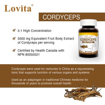 Lovita selected 5:1 high concentration Cordyceps and manufacted it under regulation of Health Canada NPN 80050521. In traditional Chinese medicine for centuries, Cordyceps is a type of fungus with medicinal properties and is believed to boost the immune system and improve respiratory function.