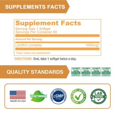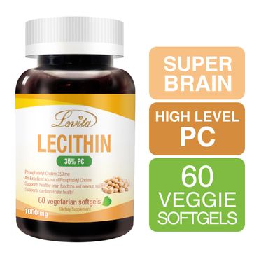 Lecithin is an essential fat that every cell in the body depends on for structure and functioning. Lovita Lecithin contains 35% phosphatidyl choline that is needed to support healthy memory, brain and nerve function. It also promotes cardiovascular health.