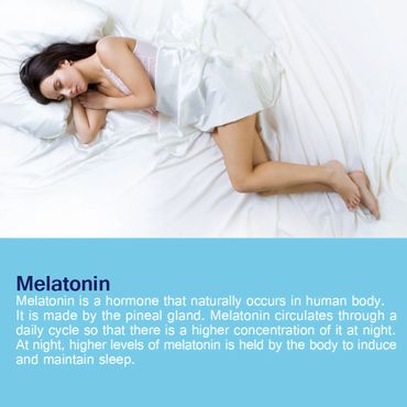Melatonin is a hormone that naturally occurs in human body. It is made by the pineal gland. Melatonin circulates through a daily cycle so that there is a higher concentration of it at night. At night, higher levels of melatonin is held by the body to induce and maintain sleep.