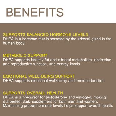 SUPPORTS OVERALL HEALTH – DHEA is a precursor for testosterone and estrogen, making it a perfect daily supplement for both men and women. Maintaining proper hormone levels helps support overall health.