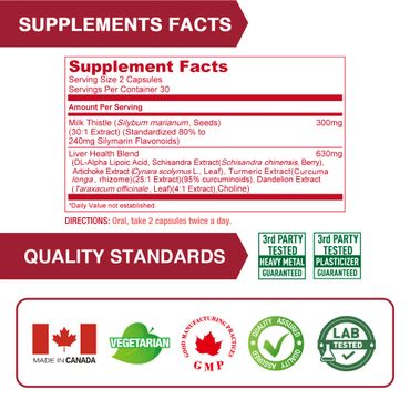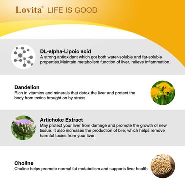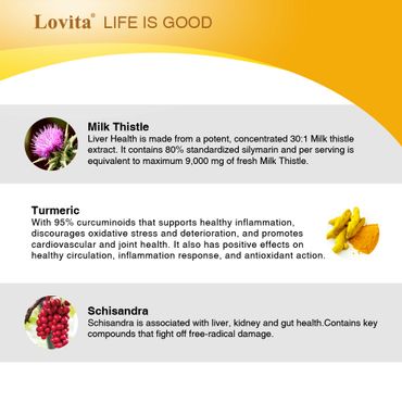 Each serving Lovita Liver Health contains 300mg of high quality Milk Thistle Extract (80% standardized Silymarin). It also contains DL-Alpha Lipoic Acid, Schisandra Extract, Artichoke Extract, Turmeric Extract, Dandelion Extract and Choline, a powerful detoxation to protect and support liver health.