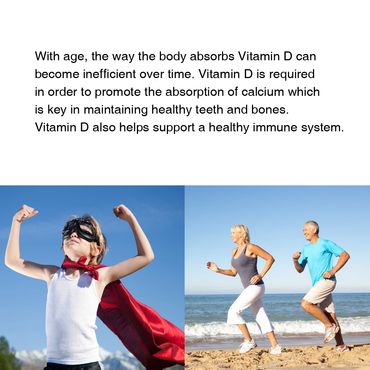 With age, the way the body absorbs Vitamin D can become inefficient over time. Vitamin D is required in order to promote the absorption of calcium which is key in maintaining healthy teeth and bones. Vitamin D also helps support a healthy immune system.