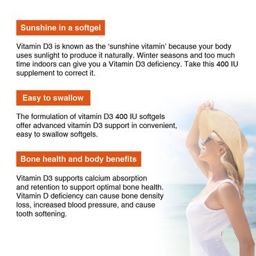 Vitamin D3 is known as the ‘sunshine vitamin’ because your body uses sunlight to produce it naturally. Winter seasons and too much time indoors can give you a Vitamin D3 deficiency. Take this 400 IU supplement to correct it.