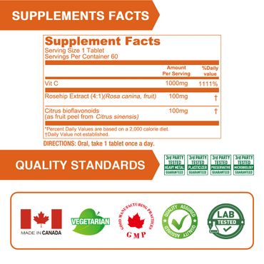 Our vitamin C-1000 has a measured dose of Rose Hips(100mg, 4:1 extract) and Citrus Bioflavonoids(100mg, 10% Hesperidin) to provide additional antioxidant support, ensuring you get more out of every serving.